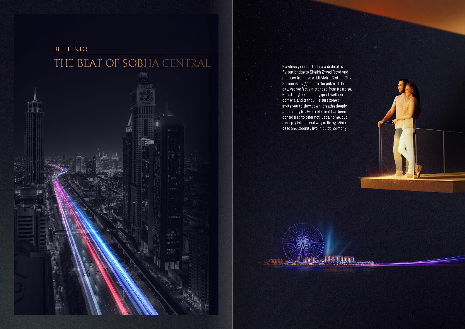 The Serene at Sobha Central, Sheikh Zayed Road, is a premium mixed-use development by Sobha, offering residential, retail, wellness, and office spaces in one integrated urban ecosystem. Located directly on Sheikh Zayed Road, The Serene provides elevated city living with panoramic views of Dubai Marina, Jumeirah Islands, Bluewaters, and Palm Jumeirah.